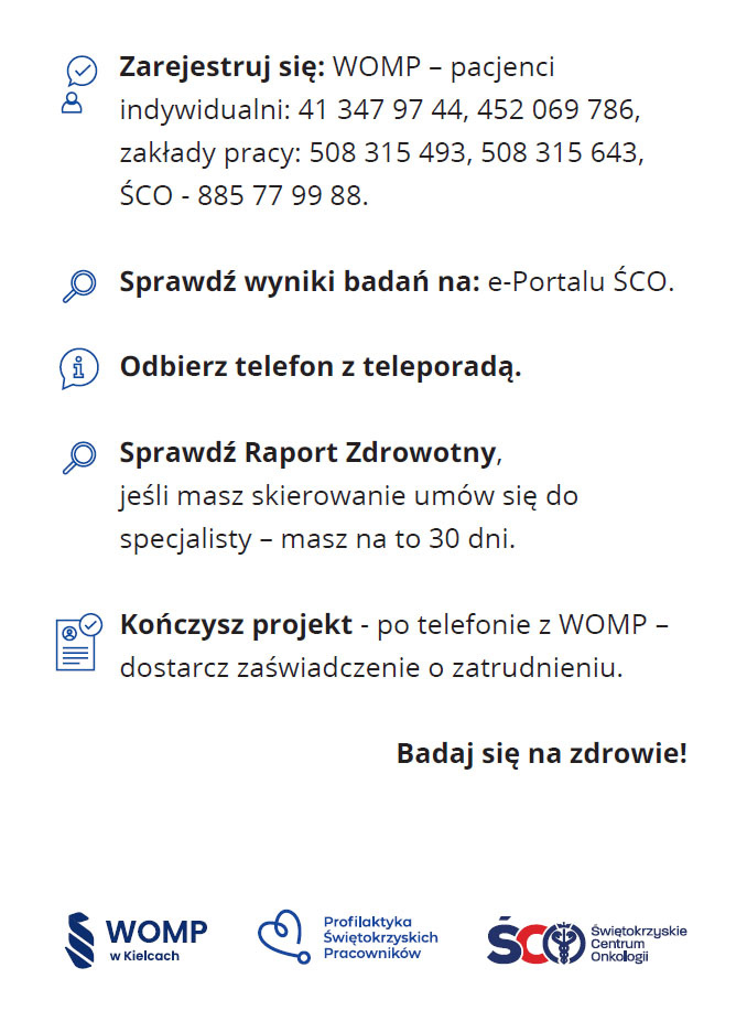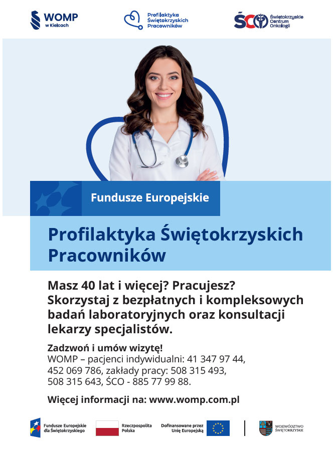 Wojewódzki Ośrodek Medycyny Pracy w Kielcach i Świętokrzyskie Centrum Onkologii realizują projekt „Profilaktyka Świętokrzyskich Pracowników”. Projekt skierowany jest do pracowników z województwa świętokrzyskiego w wieku 40+. Oferowane są w nim kompleksowe i bezpłatne badania profilaktyczne, a także konsultacje u specjalistów.